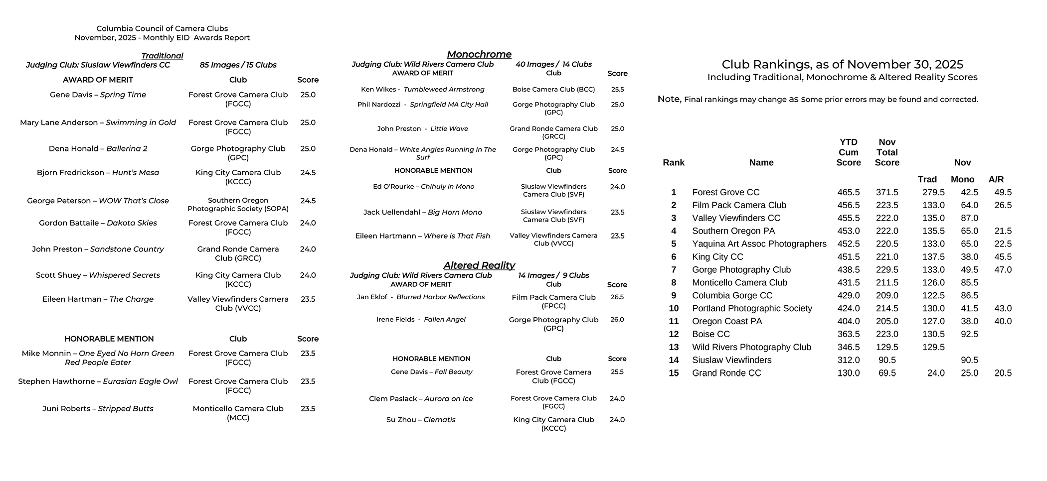 November 2025 Individual Scores by Club