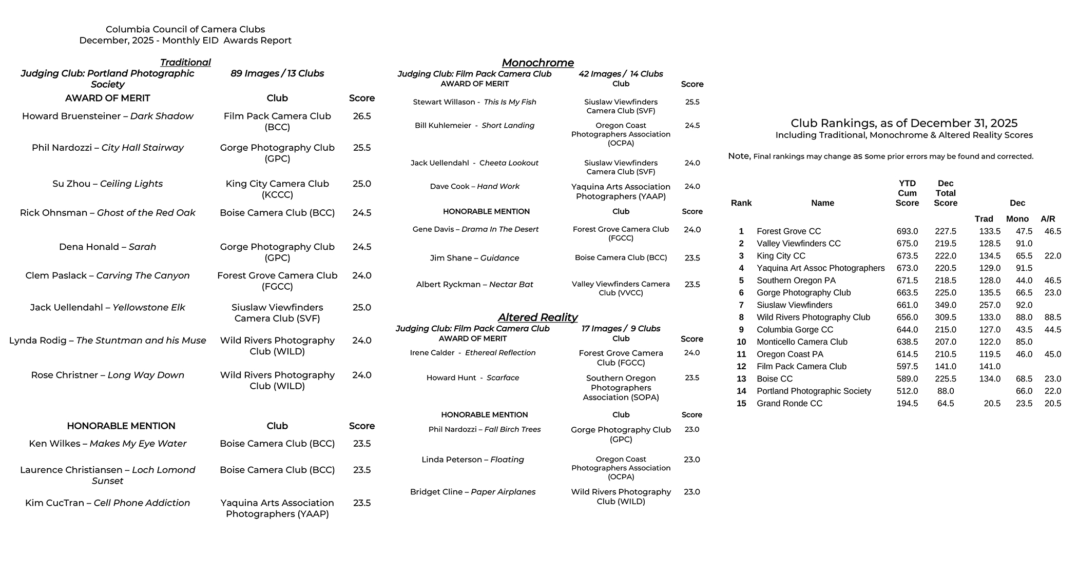 December 2025 Individual Scores by Club